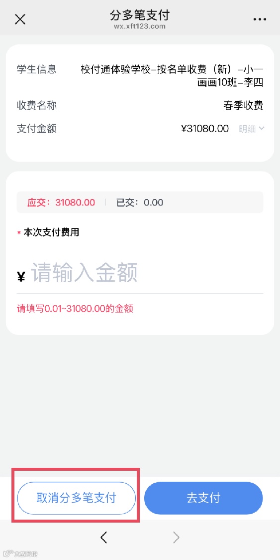 根据填写范围输入本期想要缴纳的金额后,点击“去支付”,完成后续的支付操作