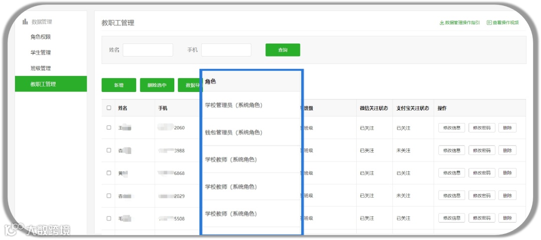 由于学校收费是由招生办独立负责,为了保障各收费项目的安全隐私,学校招生办在数据管理中对角色权限做了严格的划分。