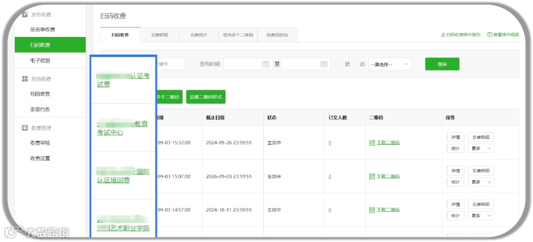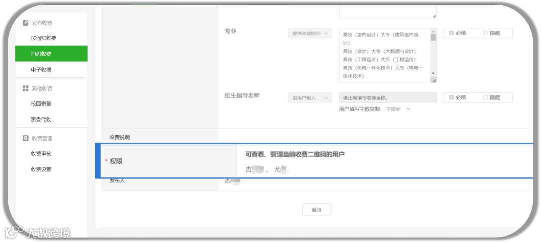 发布的收费二维码指定人对应的招生专员管理,每个招生专员都只能查看特定的收费二维码的收费信息,保证了各收费码收费信息不轻易外泄。