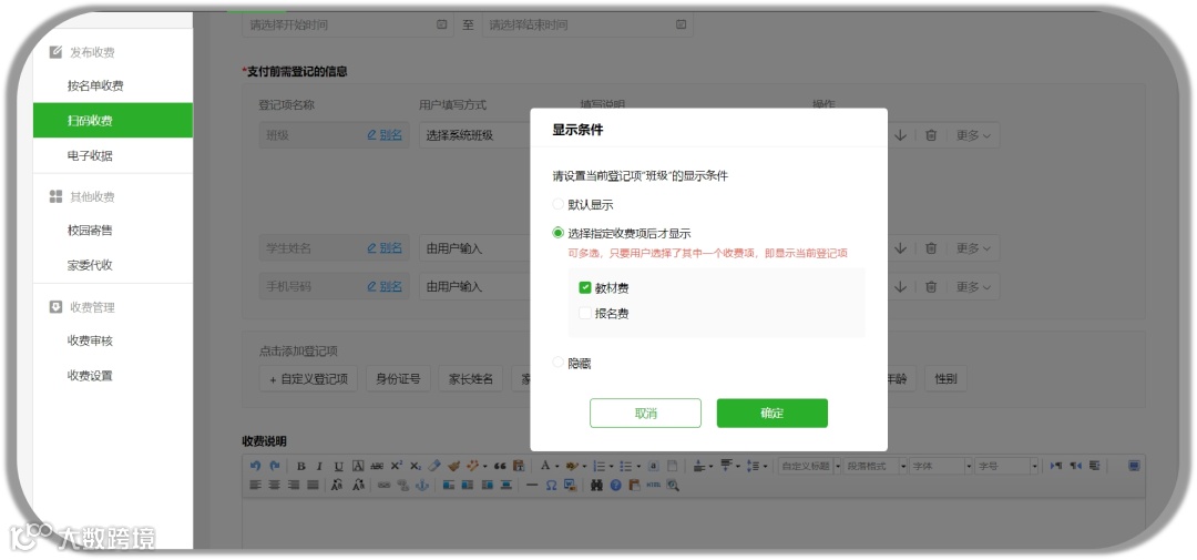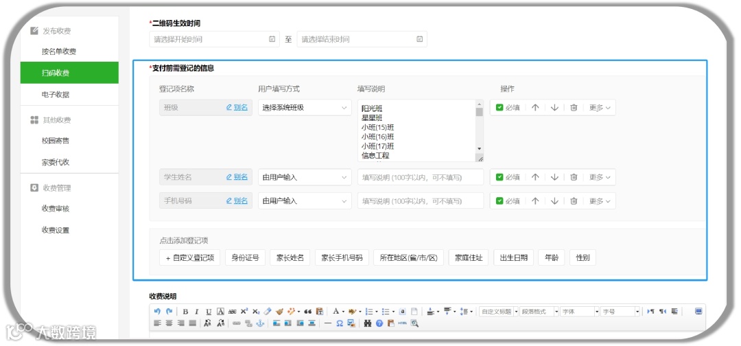 登记项信息支持指定收费项后才显示,适用在不同学员缴纳不同收费项时,填写指定的登记项的场景,更精准收集机构所需报名信息。