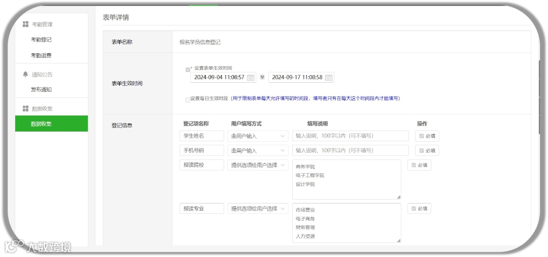 由于机构部分学员需收集信息后才能进行后续的缴费。扫码收费同时缴费+信息收集明显不适用此类场景。但机构可自行创建收集表单自行发给指定学员填写,后期对收集的学员信息发布一对一的个性化账单。