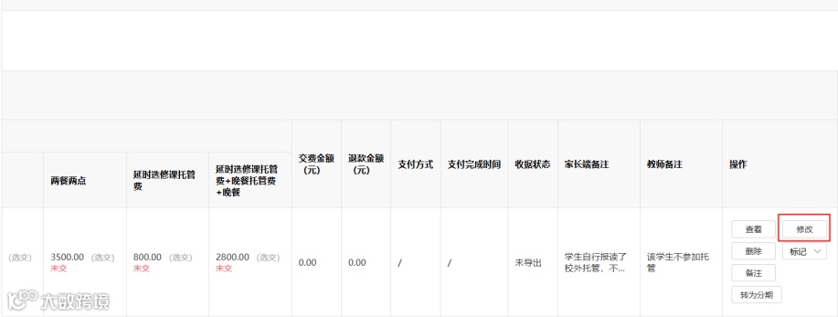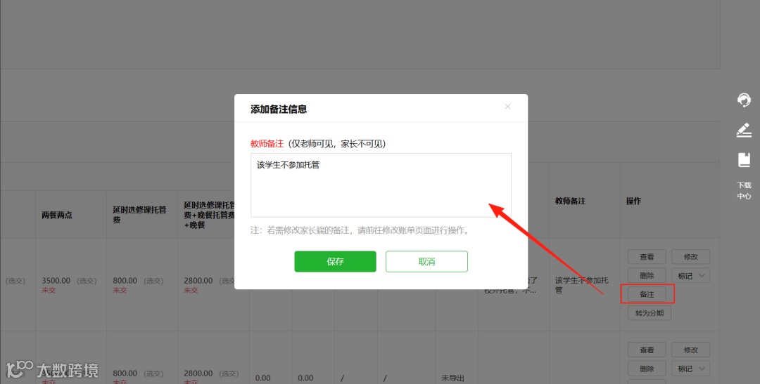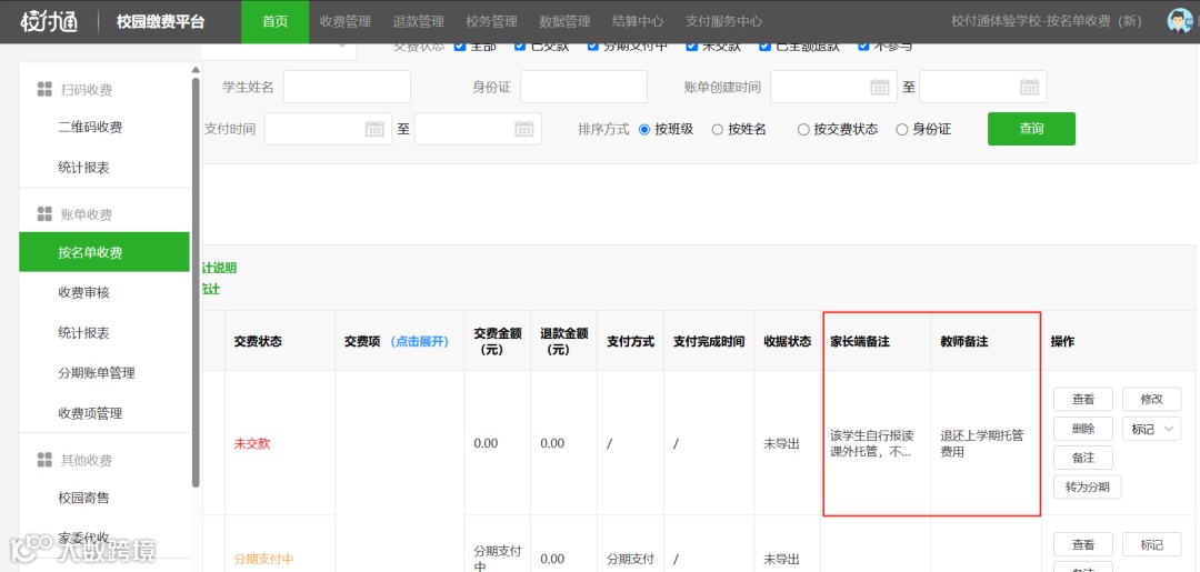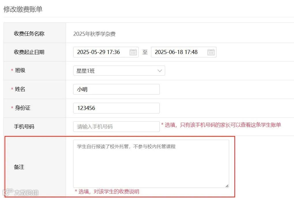 为解决收费过程中备注信息混淆问题,在账单管理界面将备注字段拆分为【家长端备注】与【教师备注】,明确区分两类备注的展示权限与修改规则。