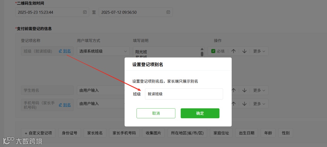 针对收费场景中登记项名称需实时调整的收费需求,已发布的收费二维码支持直接修改登记项别名,无需通过隐藏旧项或是新增登记项进行修正,能够保障已登记的历史数据完整性的同时,显著提升收费配置效率。