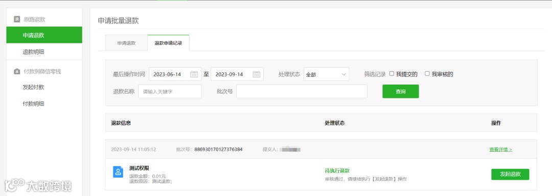 审核人审核通过退款申请后,申请人和审核人均可在【退款管理】-【申请退款】-【退款申请记录】继续发起退款操作