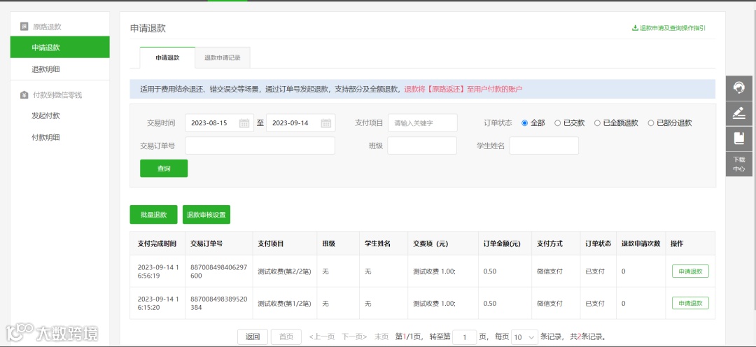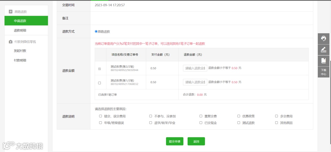 在【申请退款】页面选择需要退款的订单/子订单以及输入需要退款的金额提交申请,提交申请后会原路退回至家长的付款账户