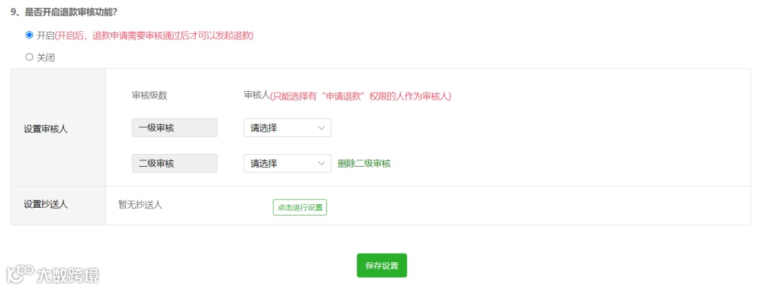 开启后,支持设置一级或二级审核人,下拉选择需要设置的审核人,保存设置即可