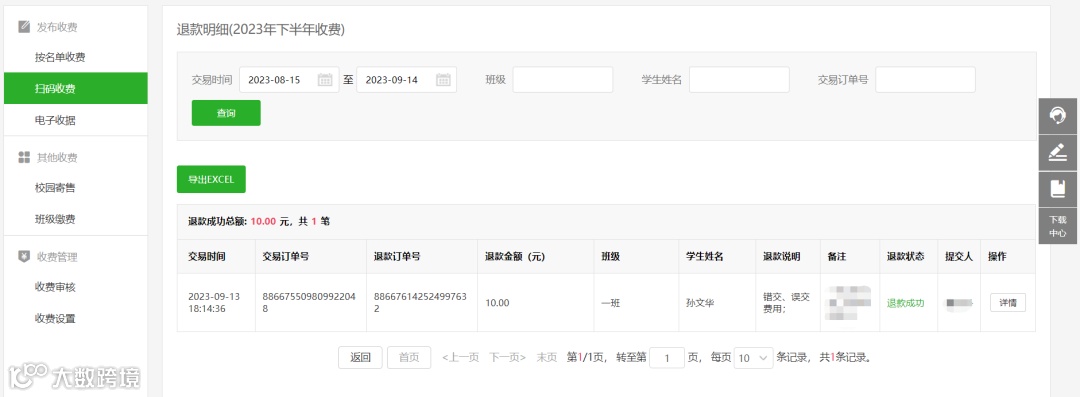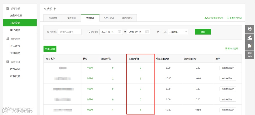 在【收费管理】-【扫码收费】-【交费统计】中选择需要查看退款明细的收费项目
