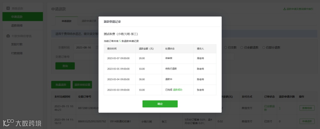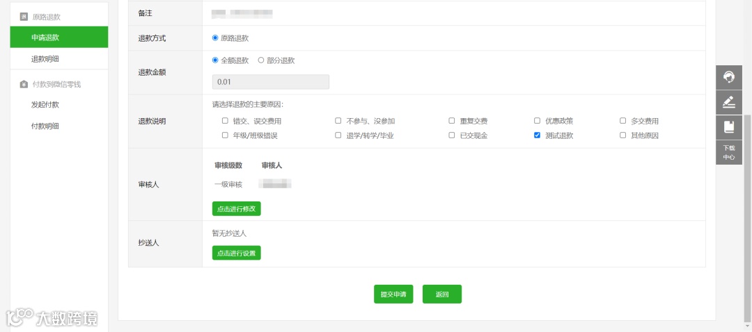 设置完成后,申请人在【退款管理】-选择【申请退款】或【批量退款】,在提交申请后,需要指定审核人审核