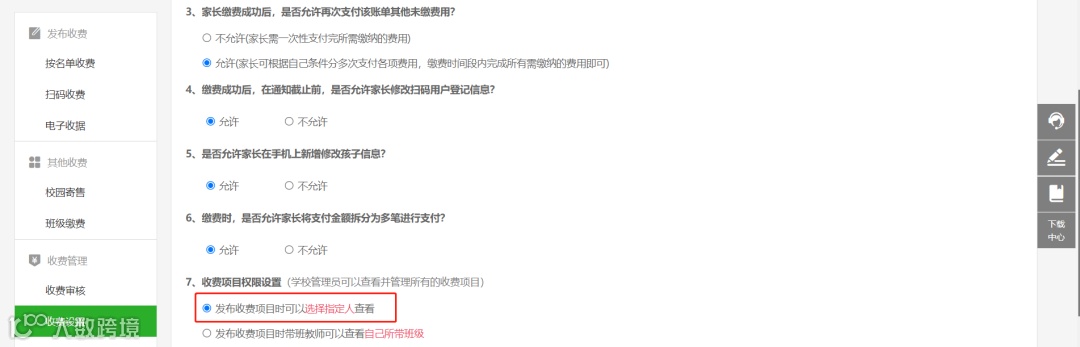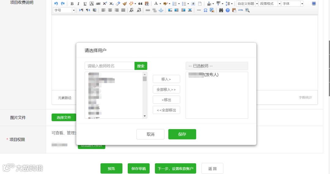 设置完成后,在【收款管理】选择发布新收费或修改原有收费项目-在【项目权限】中移入指定查看、管理该收费项目的老师