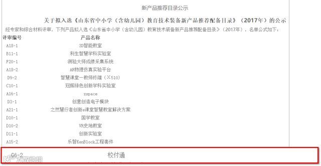 2018年2月9日,山东省技术装备服务中心将校付通列入《山东省中小学(含幼儿园)教育技术装备新产品推荐配备目录》中,让当地学校更快的找到强大实用的科技产品,助力校园科技教育的发展。