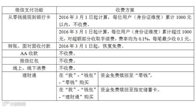 从2016年3月1日起计算,从零钱提现到银行卡,每位用户(身份证维度)有累计1000元免费提现额度,超出1000元的部分按0.1%的银行费率收取手续费。