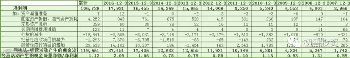 举个栗子,比如贵州茅台从2007年至2016年十年间实现净利润1067亿元,产生的经营活动现金流量净额为1197亿,经营活动现金流量净额是净利润的1.12倍。我们给这个比值起个名字,叫净现比,即净利润能不能变成现金流入,甚至是超额流入。