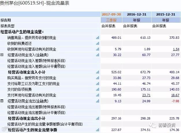理解上就是企业主营业务收入创造的现金流,计算上使用经营活动现金流入减去经营活动现金流出,看下图茅台的经营活动现金流量净额计算表,流入主要是销售商品或者提供劳务收入的现金,流出主要是购买商品或者接受劳务支付的现金、支付的人力资源费用、税费等等。