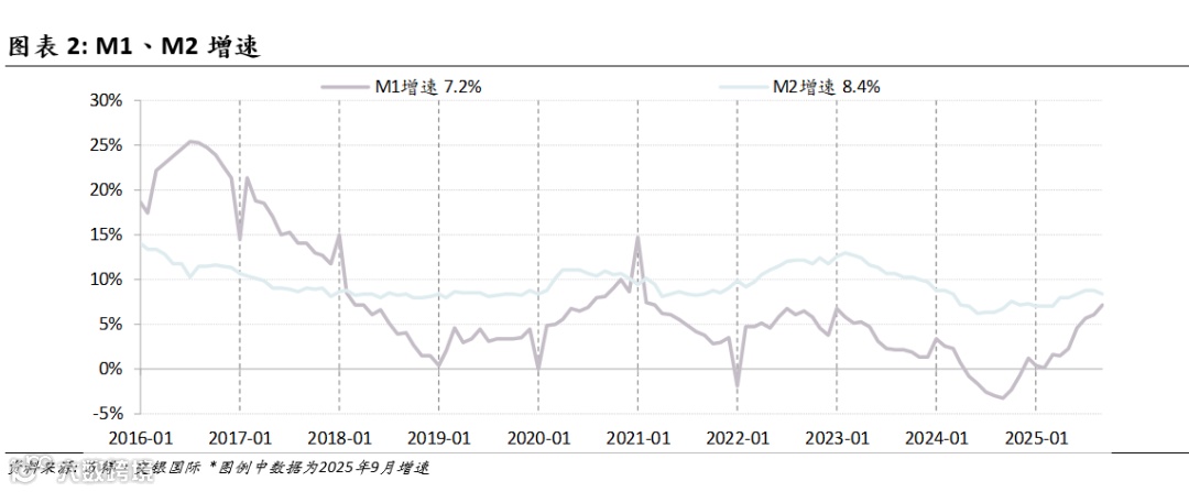 9月M1增速(2025年1月统计口径更新,新加入个人活期存款、非银行支付机构客户备付金)为7.2%,环比提升1.2个百分点,4月以来保持增速提升势头;M2增速为8.4%,环比下降0.4个百分点;社融余额增速为8.7%,环比略降0.1个百分点。
