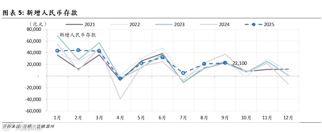 9月新增人民币存款2.21万亿元,同比少增1.53万亿元,同比少增主要来自非银机构存款。居民存款新增2.96万亿元,同比多增7600亿元;企业存款新增9194亿元,同比多增1494亿元;财政存款净减少8400亿元,同比多减6042亿元。非银机构存款净减少1.06万亿元,同比多减1.97万亿元,预计主要由于股市长假避险、获利了结需求,以及去年同期受“924”政策影响形成较高基数,从A股新开户数量的增长趋势来看,9月仍保持环比正增长。