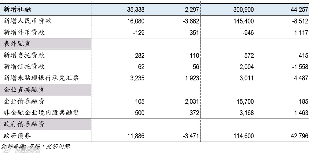 9月新增社融为3.53万亿元,略好于万得市场平均预期(3.27万亿元),同比少增2297亿元,主要由于新增人民币贷款和政府债券同比少增,而新增未贴现票据和企业债券融资同比多增。9月政府债券发行为1.19万亿元,在较高基数上同比少增3471亿元。