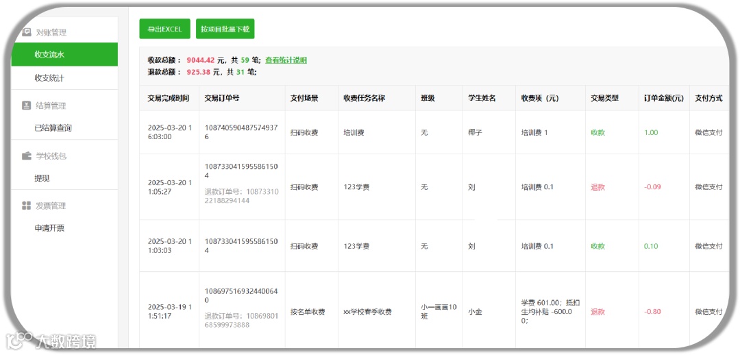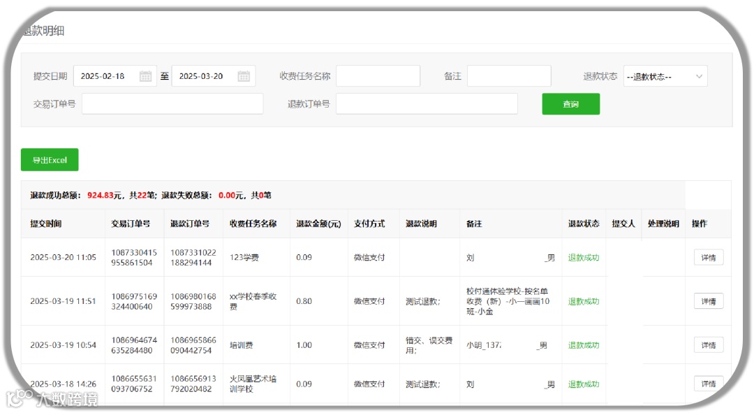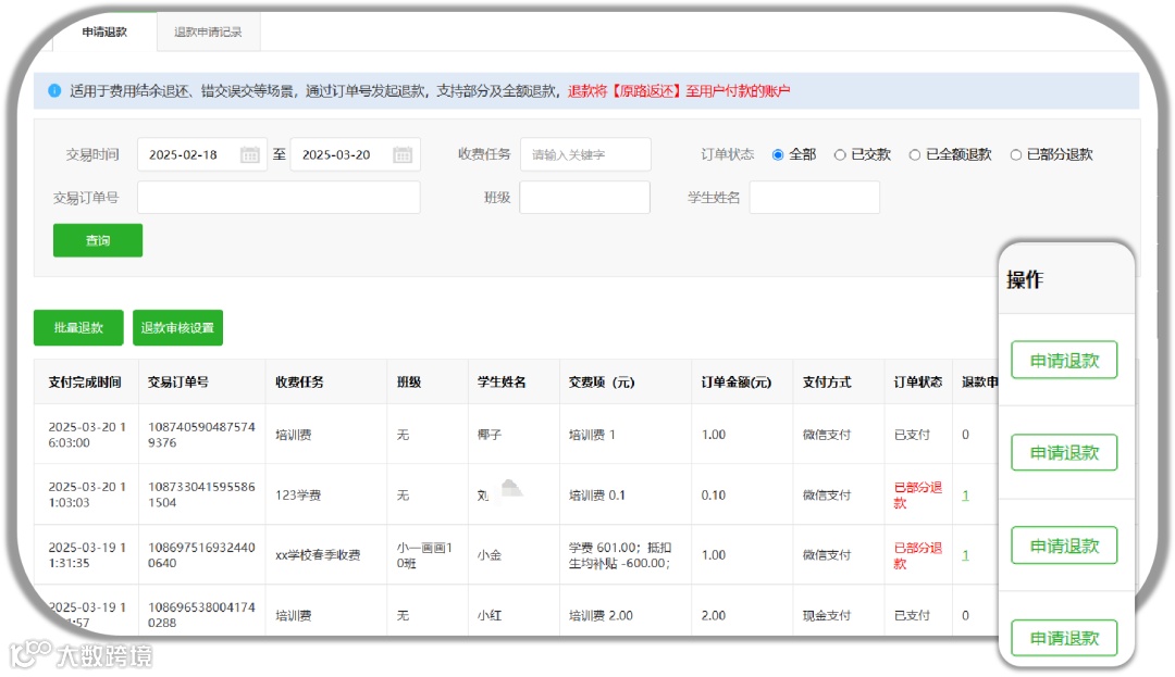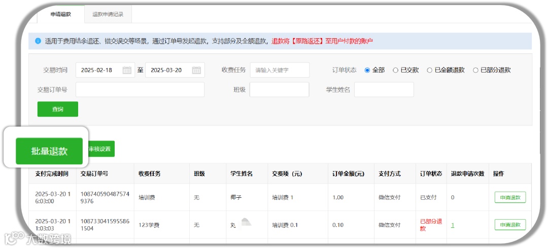 针对大量退款需求,校付通提供了强大的批量退款功能。学校/机构可按订单退款或按学生退款,平台快速生成退款表格,只需下载表格后,输入对应的退款金额,系统即可自动处理批量退款申请。不仅省去了人工汇总的工作量,还提升了退费工作的效率。