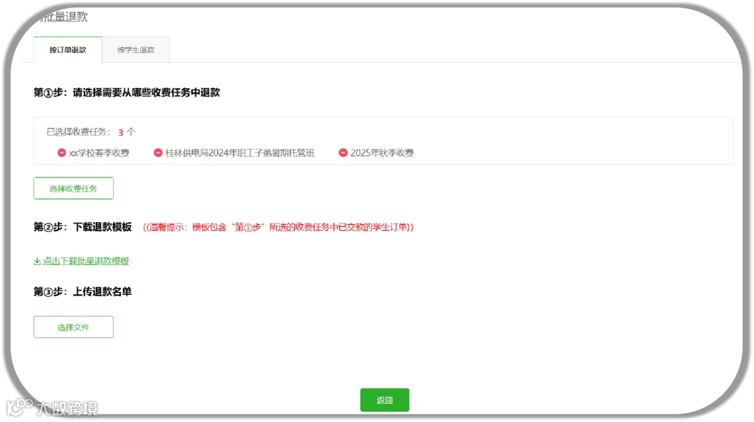*按订单退款:选择需要退费的收款任务,再下载表格