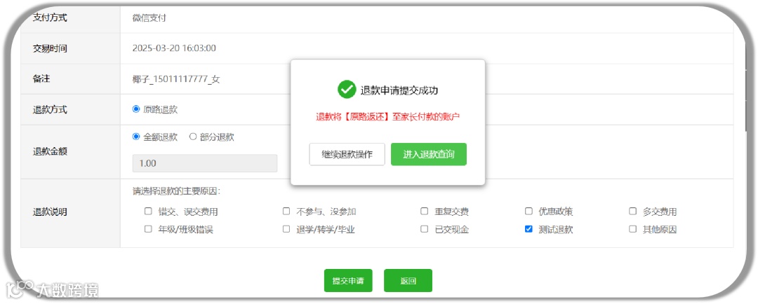 系统自动处理退款申请,最快2小时内即可将款项退回学员/家长的付款账户。