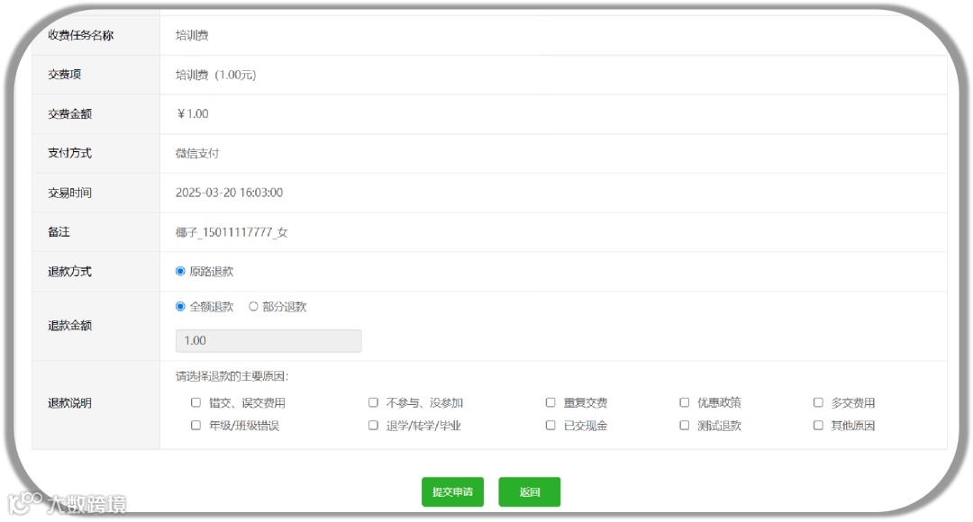 无需再繁琐地收集学员/家长的退款信息和账号信息,校付通直接实现收款原路退回,省去了不必要的收集和核对工作。