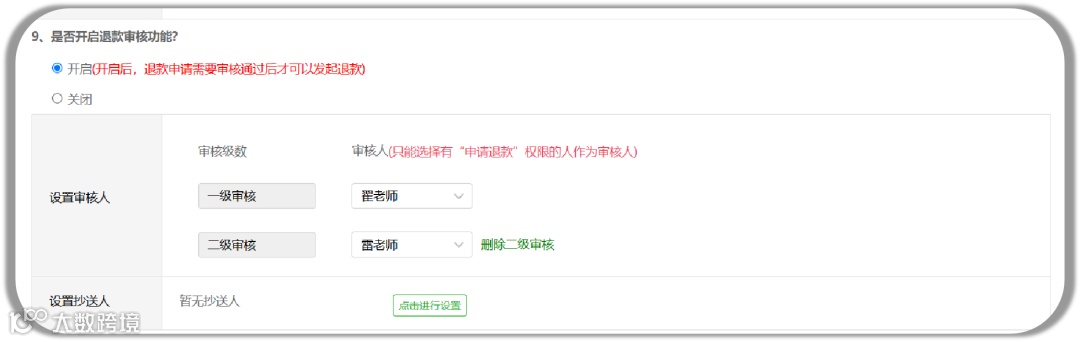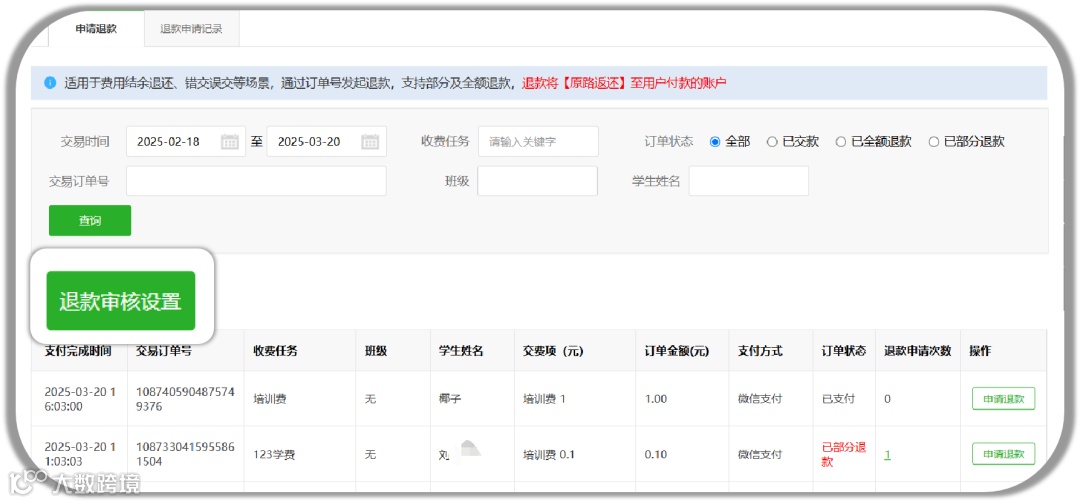 为确保资金安全,校付通支持最多设置二级退款审核人。只有审核通过后,方可继续发起退款操作。这一功能有效避免了乱退费现象的发生,提高了学校/机构的资金安全性。