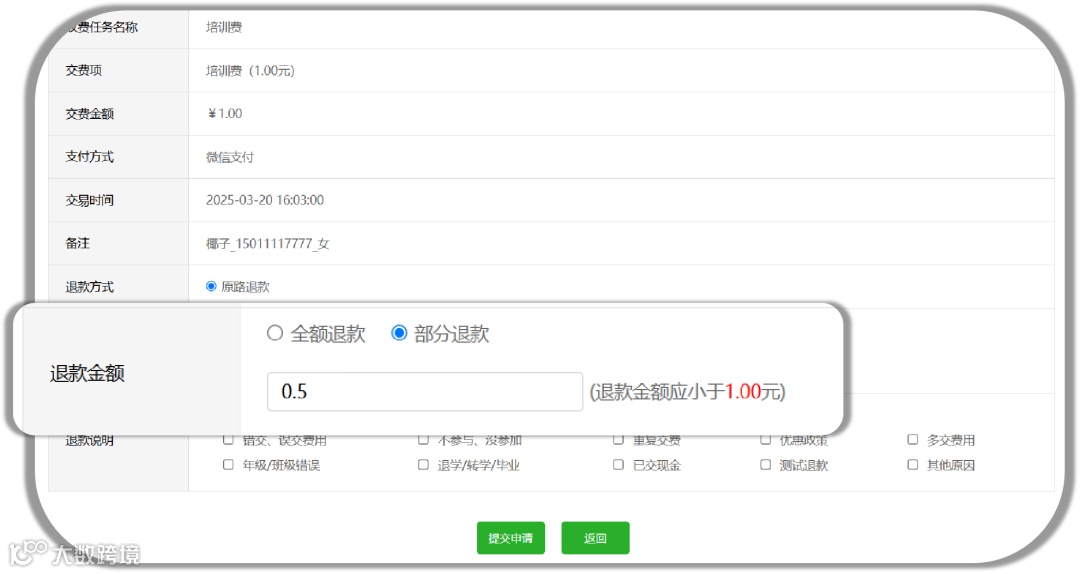 平台内置的退款管理模块同步记录了所有交易数据,学校/机构只需通过搜索、筛选功能即可快速精准定位目标交易订单。输入退款金额后,一键即可完成退款操作,无需再进行线下打款。