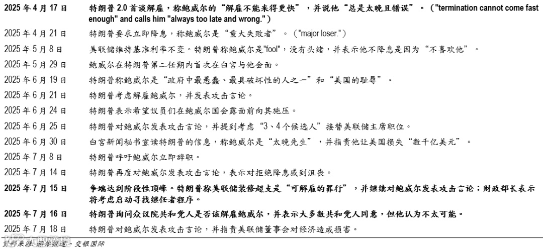 特朗普与鲍威尔的争端根源可追溯至特朗普1.0时期,核心分歧在于货币政策理念对立:特朗普一贯主张维持低利率环境,而鲍威尔坚持基于经济数据和通胀目标的决策路径。2025年7月,双方争端升级。 不同于以往分散式的批评威胁和施压,特朗普首次提出了具体的“法理依据”,市场意识到特朗普政府可能已在认真研究绕过法律约束解雇美联储主席的可行路径。此举引发了市场对美联储独立性面临前所未有威胁的担忧,并可能产生“先例效应”,或动摇美国货币政策独立性根基。
