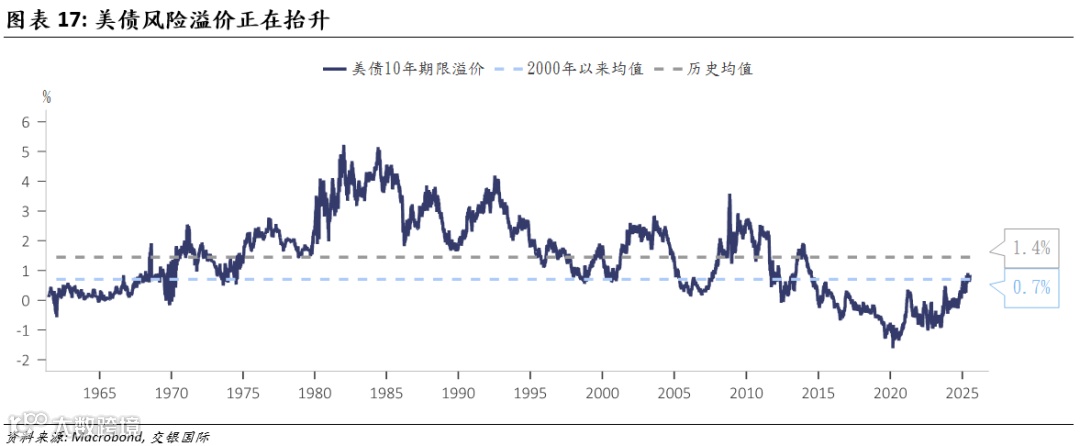 尽管美联储自2024年9月以来已累计降息约100个基点,10年期美债利率曾一度上行超过100个基点,且主要来自风险溢价,反映投资者更关注经济增长、财政政策等综合因素,而非单纯政策利率水平。若特朗普通过解雇鲍威尔的方式强行推动激进降息政策,市场很可能将此解读为货币政策独立性受到挑战的信号,进而可能进一步推高长期利率以补偿额外的通胀和信用风险溢价。