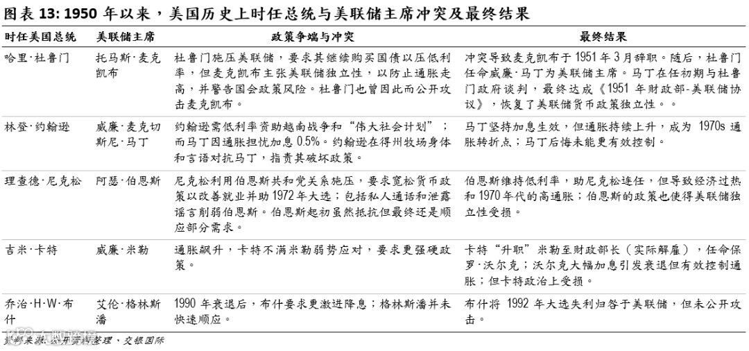 法律层面的“硬约束”:《联邦储备法》明确规定美联储主席任期为四年,总统仅能“因故”(for cause)免职,且必须是严重失职或犯罪等重大过失,而非政策分歧,且这一条款从未被实际执行。前文提及尽管特朗普政府试图以美联储总部翻新项目成本超支为由寻找法律依据,但最高法院在涉及独立机构的判例中要求解雇必须有“正当理由”,而装修成本超支在政府建设项目中极为常见,很难构成“严重失职”的法律标准。历史上,总统与美联储主席产生过多次冲突,但几乎没有总统解雇美联储主席的先例。1951年时任美国总统杜鲁门与麦克凯布辞职和《财政部-美联储协议》结束,没有强制解雇,且后继者且马丁通过谈判甚至巩固了美联储的独立性。