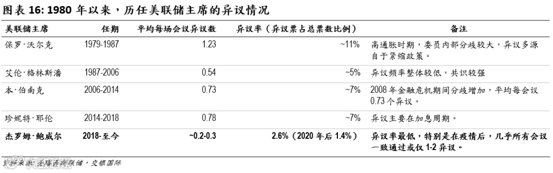 市场可能过度关注鲍威尔在过去的政策表现,而低估了其作为美联储主席在维护内部团结和决策一致性方面的成就。鲍威尔因2021-2022年期间坚持“通胀暂时论”,错失最佳加息的机会,而饱受市场诟病。然而,纵观整个加息周期的执行过程来看,FOMC声明均显现出极高的一致性。美联储系统包括7名理事会成员和12名地方联储主席,这19名在经济背景、政策倾向和地区利益方面存在显著差异。历史上,FOMC会议经常出现明显分歧,异议票和不同观点的公开表达并不罕见。尽管私下讨论中确实存在不同声音,但这些分歧很少在正式投票中体现为异议票,也反映了鲍威尔在美联储的影响力。