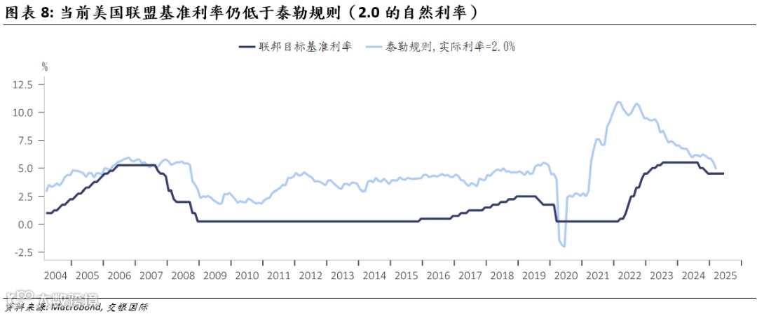 从技术指标角度分析,当前利率水平并未明显偏离相对合理区间,特朗普对“高利率”的批评或更多体现主观政治偏好而非经济现实。从近期的金融条件指数来看,当前的政策利率水平并未对金融市场造成过度紧缩压力。随着市场对关税政策不确定性的担忧逐步缓解,资产价格波动明显回落,整体流动性状况已回归相对宽松状态。从货币政策理论框架来看,泰勒法则提供了评估利率适度性的重要基准——基于通胀水平、产出缺口等核心经济变量,计算理论上的最优政策利率。当前联邦基金利率甚至低于泰勒法则所建议的理论水平。从实际利率来看,当前利率水平确实高于过去10年来任何时期的水平,主要反映了2008年金融危机后长期超低利率环境的结束,但相较于2008年以前,当前利率水平也仍在合理范围。