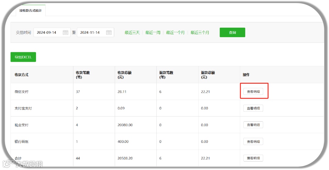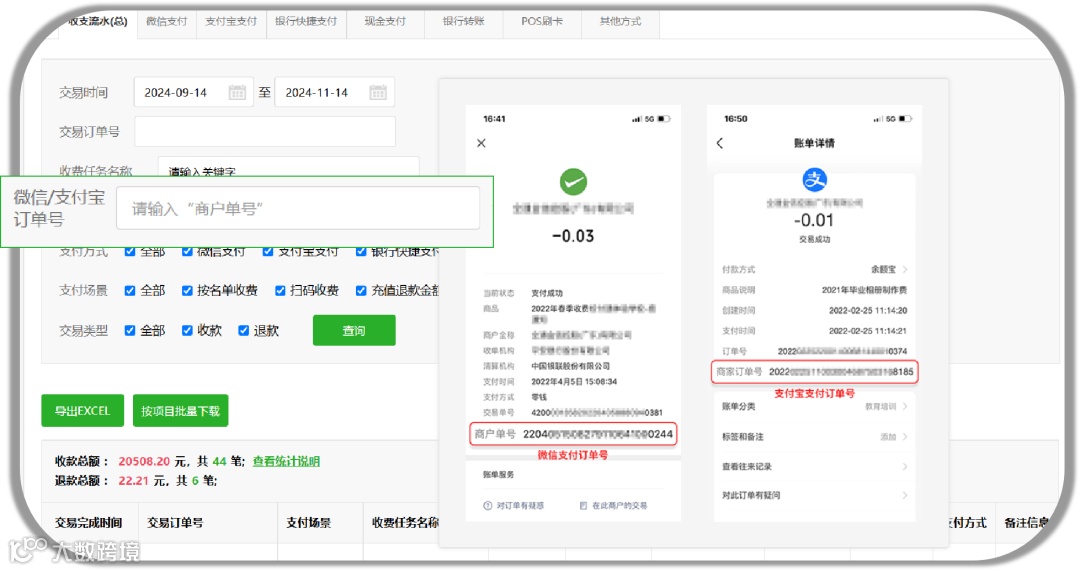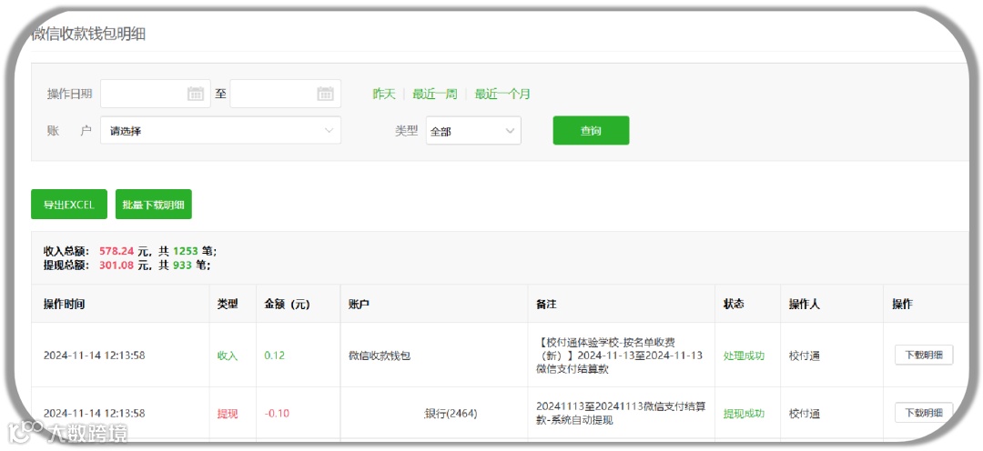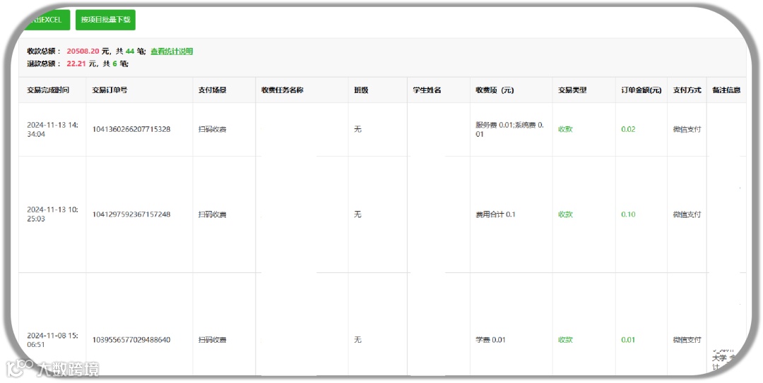 同时,平台还对各种收款方式进行了汇总。财务老师能够自行选择汇总月份,查看和下载该月份的收款、退款情况,甚至每一笔交易的订单明细都一览无余。这一功能不仅为财务老师节省了大量统计汇总的时间,还减少了反复核对数据的工作量。