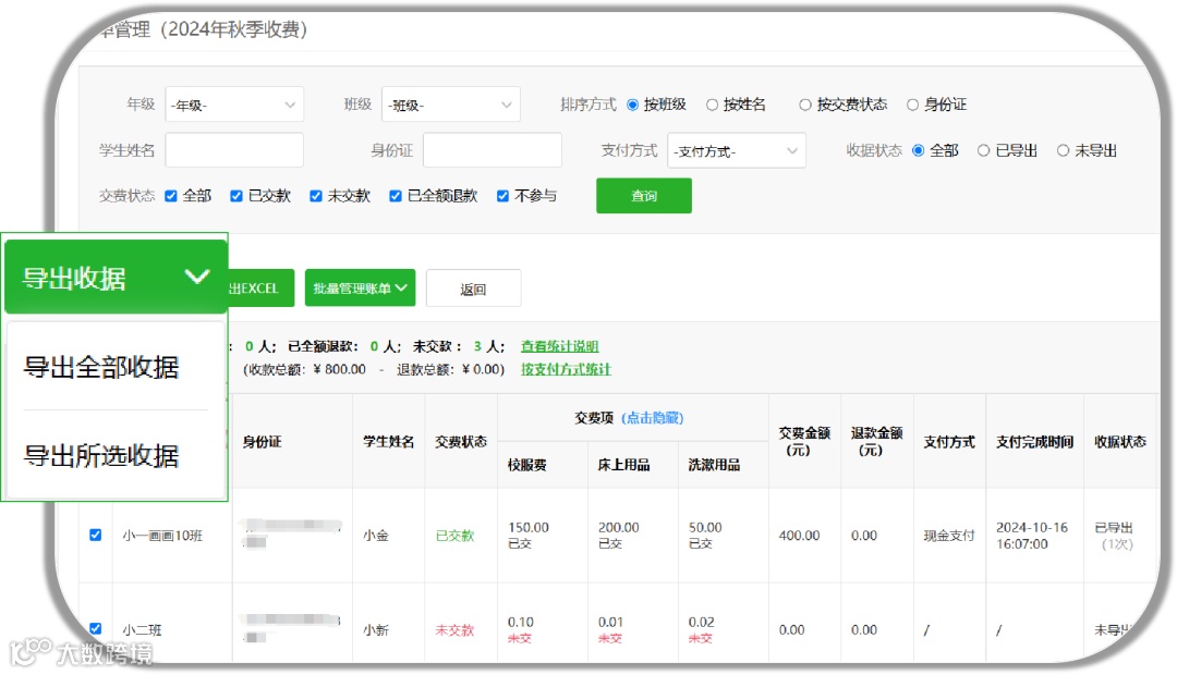 而且支持批量导出收据,这可大大地减轻财务老师手写收据的繁重负担。