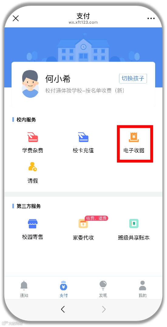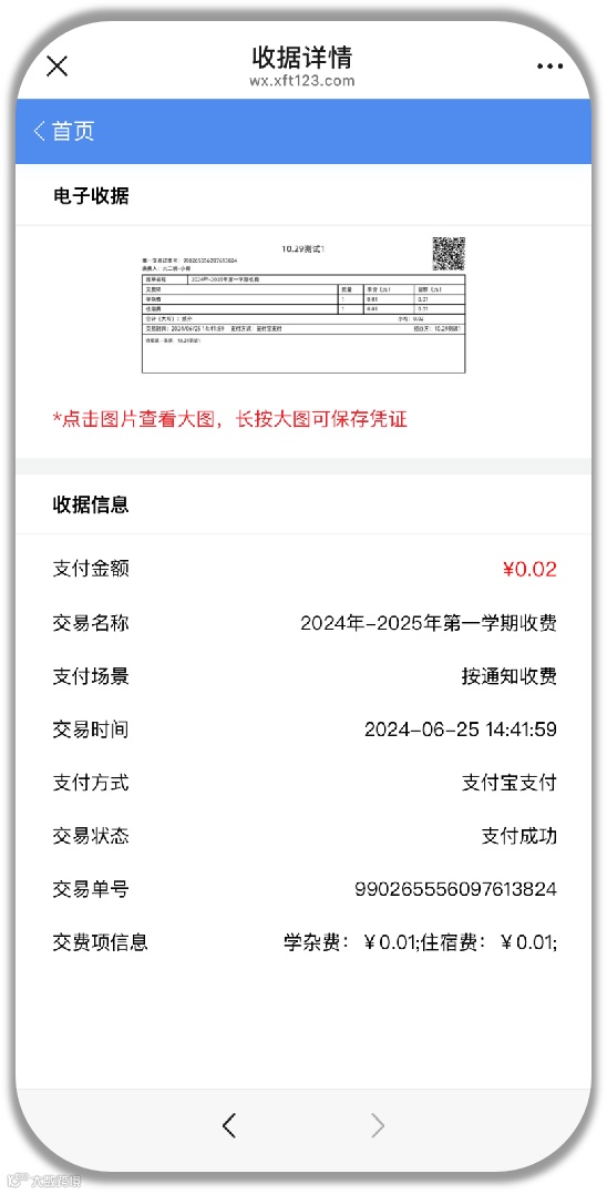 财务老师可以引导家长在【校付通】公众号自行获取电子收据,家长缴费完成后即可线上获取,不受地域和时间的限制,财务和家长双方都能省时省力。