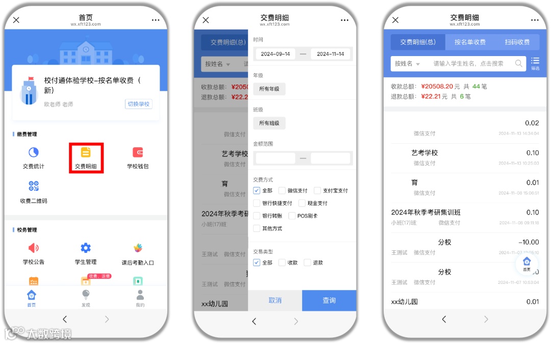 校付通作为功能强大的收费管理平台,不仅能为学校、机构日常收费工作提供有力保障,极大地提升收费效率,而且结算后台更是减轻财务老师对账工作压力的关键所在。