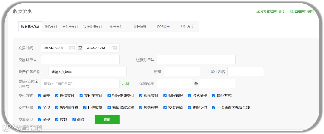 ⭐️还有一个隐藏的查询小技巧哦!当家长/学生反馈已经缴费,但是在平台却查不到相应的交易记录时,别慌!财务老师可以根据家长/学生提供的支付截图中的交易单号进行查询,就能迅速定位到对应的交易记录啦!