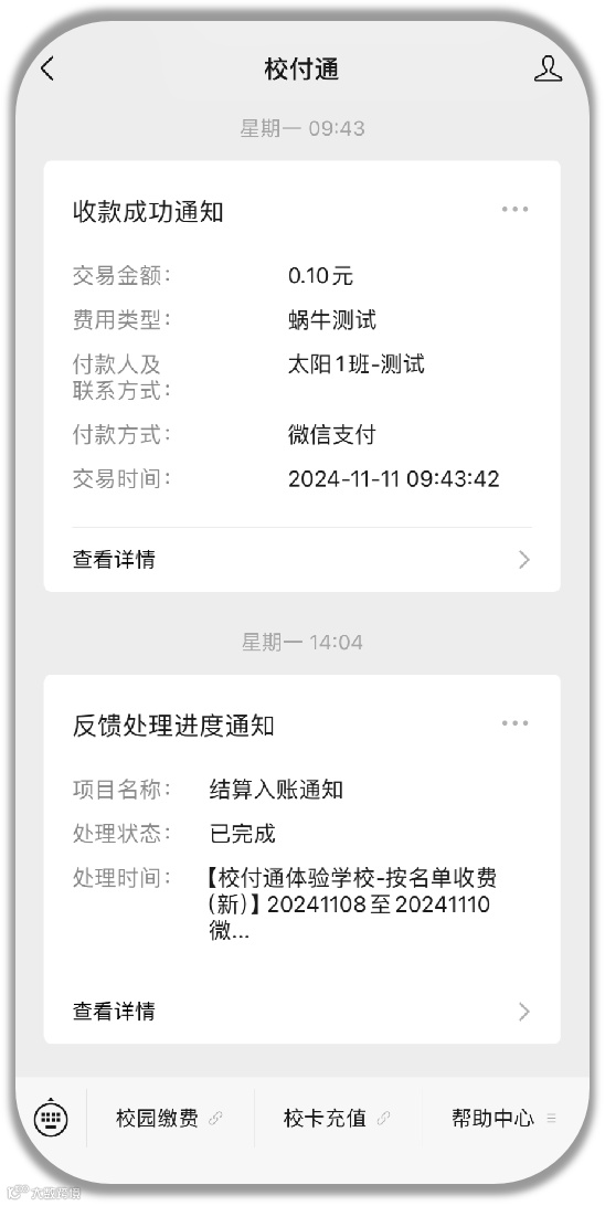 财务老师只需关注【校付通】公众号,并开启手机端的收款通知提醒功能,当学生/家长缴费成功、结算金额到账、提现金额到账时,系统会即刻推送消息,确保财务老师不会错失任何一笔交易信息,还能在线查看详细的交易信息。