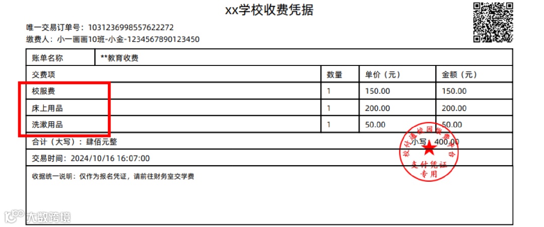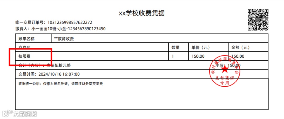 校付通的收据导出功能不仅可以导出整个收费项目的电子收据,还能满足单个收费项电子收据的导出需求,这两种形式与实际工作场景完美契合。