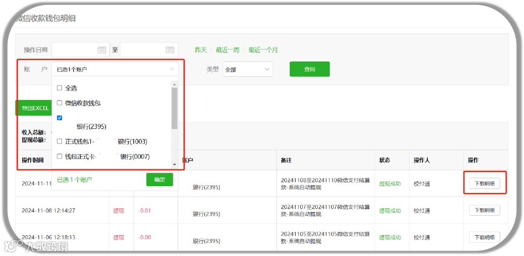 每个账户的入账明细都可以在平台下载查询,每一笔都有详细记录,清晰明了。