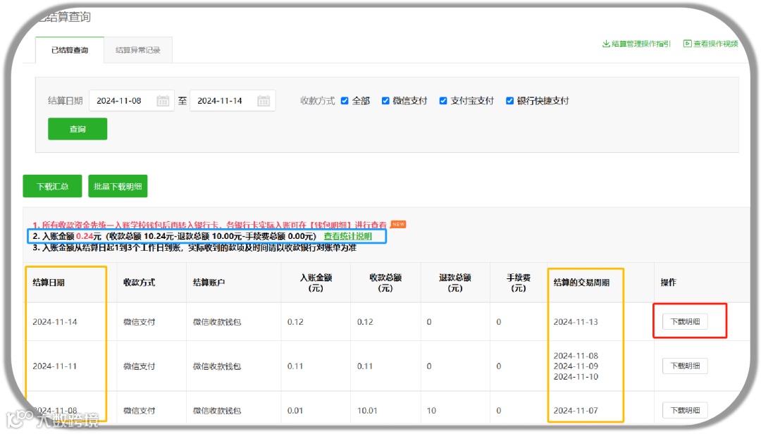 财务老师可以在结算后台查看详细的结算、入账记录。线上收款的金额会在T+1个工作日自动结算并入账到指定账户,也支持手动提现。财务人员既可以在已结算查询中查看、下载入账明细,也可以在提现中的钱包明细查看、下载入账记录。