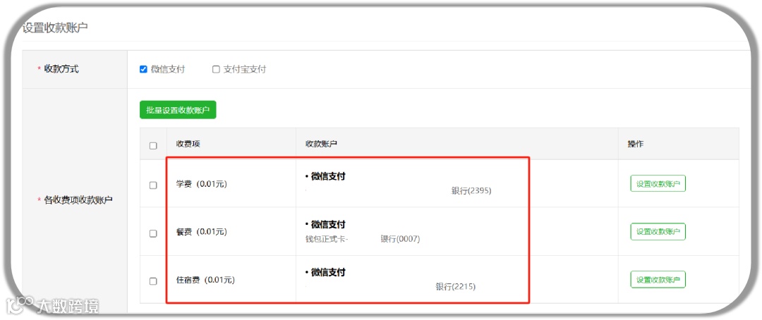 校付通支持设置多级收款账户,无论是针对不同收费项目指定入账的方式,还是集团学校下多个分院使用独立账户等复杂场景,都能轻松应对,满足灵活分账的需求。