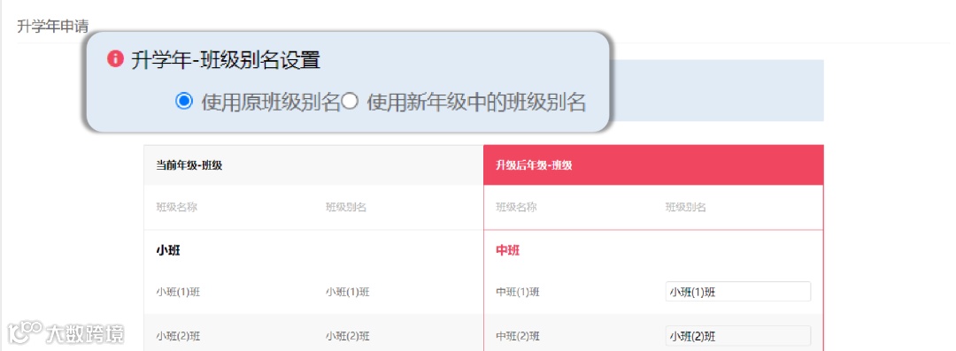 ①点选【使用原班级别名】:升学年成功后,则班级别名跟升级前一样不变,且不可编辑;