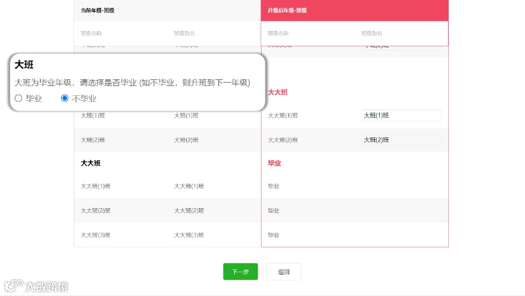 ①“升级前年级-班级”选择了“毕业”,则“升级后年级-班级”的“班级名称和班级别名”处显示“毕业”,且毕业班的学生数据会自动清除,不可找回!