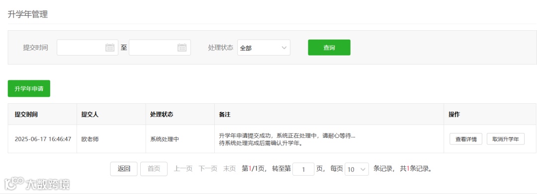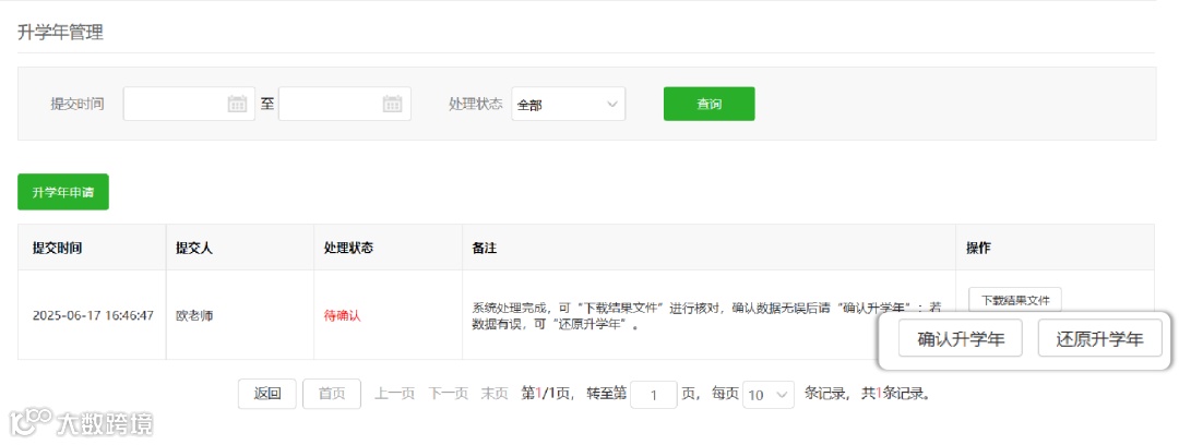 *确认提交后,系统会自动进入数据处理阶段,次日完成升学年数据调整。