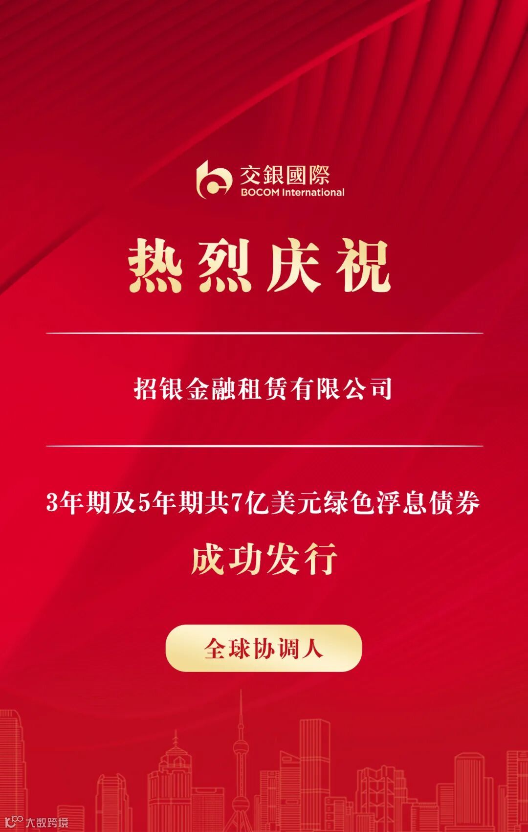 5月29日,交银国际作为全球协调人助力招银金融租赁有限公司(“招银金租”)成功发行3年期及5年期共7亿美元绿色浮息债券。招银金租于交易当天分别以初始价SOFR复合指数+120基点、SOFR复合指数+130基点宣布双年期交易。交易开簿便获投资者热烈认购,下午订单总量峰值超 27 亿美元,超额认购 3.8 倍,最终 3 年期和 5 年期债券分别定价 SOFR 复合指数 +68 基点、SOFR 复合指数 +80 基点,较初始价格分别大幅收窄 52 个基点、50 个基点。此次债券发行收到市场高度认可,众多境内外银行、基金及资管等高质量投资主体踊跃参与。