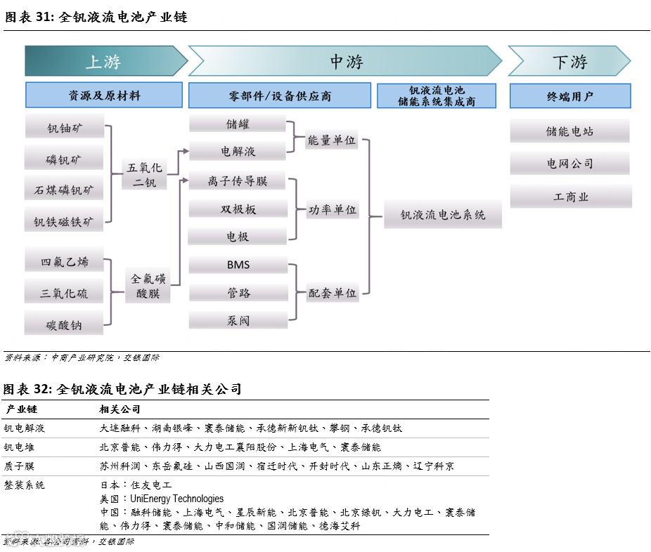钒液流电池的核心部件可以分为能量单元、功率单元和配套系统。其中,能量单元的核心是电解液,能够直接影响能量单元的性能与成本。功率单元由一定数量和规格的电堆串并联构成,其中单个电堆主要由离子交换膜、电极、双极板、BMS等关键部件构成。钒液流电池产业链包括:上游钒资源的开采与冶炼;中游全钒液流电池储能系统的设计与制造,包括功率单元(电堆)与能量单元(电解液)两大部分;下游主要为储能项目的开发和运营。