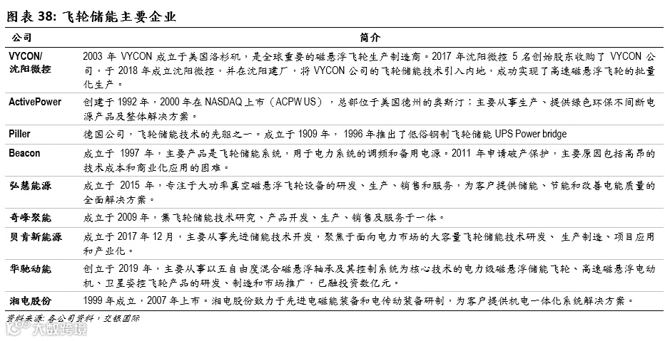 美国在20世纪90年代中后期率先进入产业化发展阶段,向不间断供电过渡电源领域提供商业化产品。中国内地飞轮储能起步晚于欧美,2022年拥有首台自主知识产权的兆瓦级飞轮储能装置。国际上主要的飞轮储能厂商有 VYCON、ActivePower、Beacon、Piller 等,而中国内地有主要有弘慧能源、奇峰聚能、贝肯新能源、华驰动能等,湘电股份业务主要涉及高速永磁电极和电磁轴承。