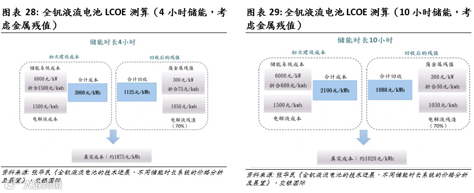储能时长增加,全生命周期成本也将下降。由于全钒液流电池的电解液可再生循环使用,因此其残值很高。同样以储能时长为4小时的钒液流电池储能系统为例,其中废金属的残值估值为300元/kW,折合为75元/kWh,电解液残值约为原有的70%即1,050元/kWh,合计残值为1,125元/kWh,实际成本为1,875元/kWh。而对于储能时长为10小时的系统来说,废金属残值折合为30元/kWh,合计残值为1,080元/kWh,实际成本仅为1,020元/kWh。