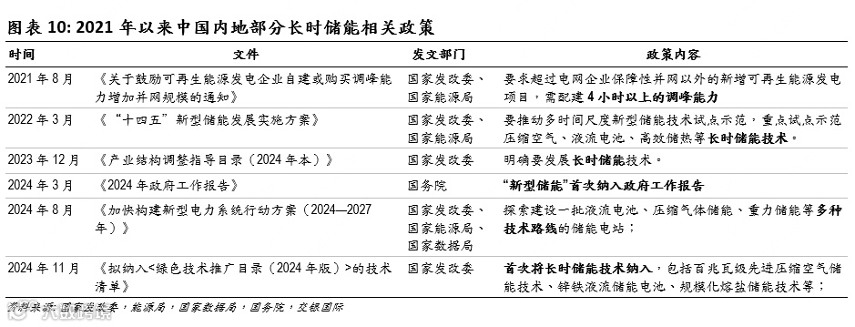 内地已出台多项政策,促进长时储能和新型储能技术的发展与应用。早在2021年8月,国家发改委、能源局已发布《关于鼓励可再生能源发电企业自建或购买调峰能力增加并网规模的通知》,其中要求超过电网企业保障性并网以外的新增可再生能源发电项目,需配建4小时以上的调峰能力。2022年3月,国家发改委、能源局印发的《“十四五”新型储能发展实施方案》提出,要推动多时间尺度新型储能技术试点示范,重点试点示范压缩空气、液流电池、高效储热等长时储能技术。2023年12月,国家发改委发布《产业结构调整指导目录(2024年本)》,在十四五“新型电力系统技术及装备”中,明确要发展长时储能技术。2024年3月,新型储能首次被纳入政府工作报告中。