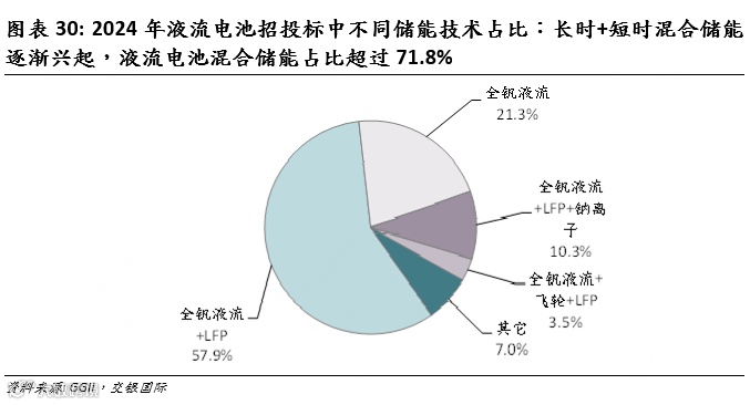 根据GGII数据,2024年液流电池招投标超3GW,其中混合储能占比超过71.8%。全钒液流电池+磷酸铁锂电池(LFP)混合储能项目占比近六成,两者结合后,既发挥液流电池长时储能和高功率的特性,又借助磷酸铁锂电池提升整体能量密度,弥补了单一储能技术在不同应用场景下的缺陷。